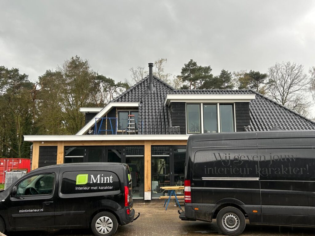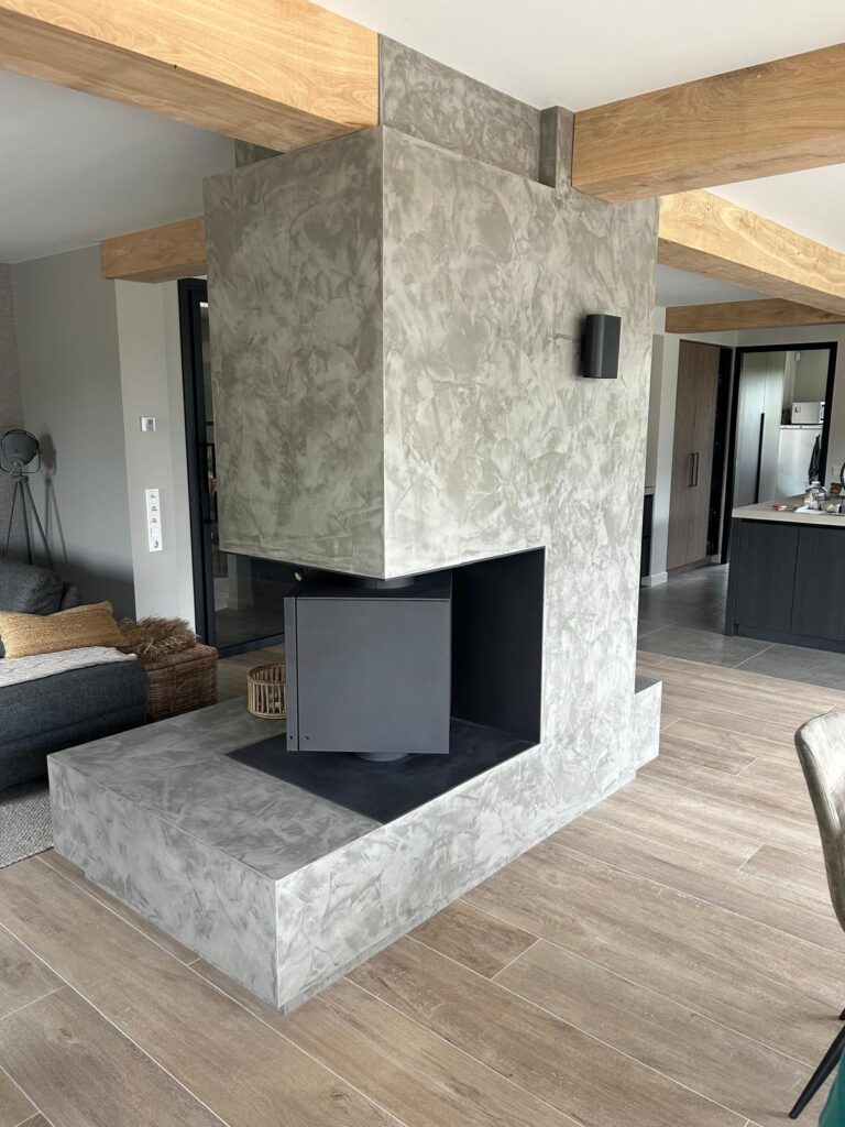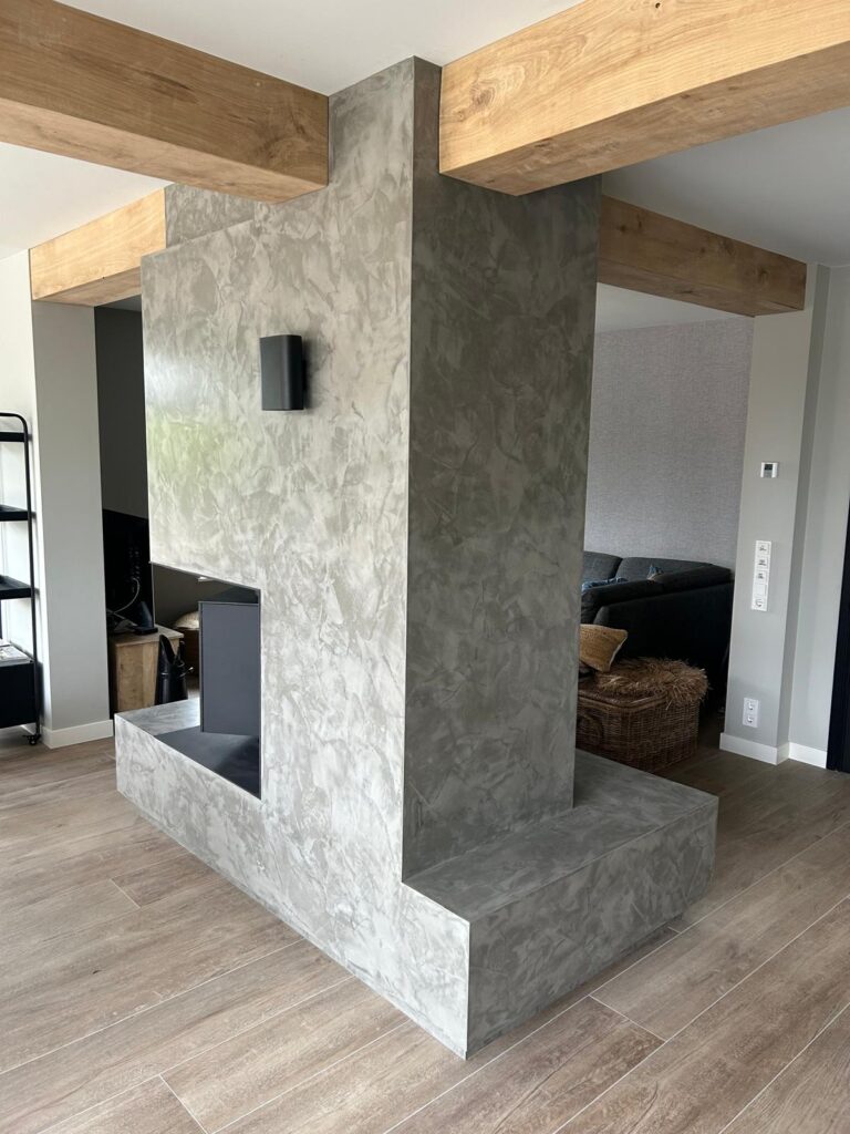 In Harfsen hebben wij een verbouwde woonboerderij mogen voorzien van 2 haarden. Binnen is centraal in de uitgebouwde woonkamer een Brunner DF 33 geplaatst. De DF 33 is een gesloten houtkachel met een zeer hoog rendement opgesloten in een draaibare kubus van gietijzer. Dit draaien van de haard kan met de hand of optioneel met een afstandsbediening. In deze situatie is de kachel voorzien van een accumulatiepakket (MAS) bovenop de kachel met ingebouwde “wokkel”. Dit alles is verwerkt achter de maatwerk ombouw met ingebouwde stalen houtnis en volledig afgewerkt in betonstuc. De gehele opstelling is voorzien van een zwevende plint voor de inlaat van convectielucht aan de onderzijde waarna deze aan de bovenzijde middels een terugvallende plint er weer uitkomt. Vanaf de verdiepingsvloer is er een dubbelwandig geïsoleerd rookkanaal aangelegd met brandwerende omkokering en luchtdichte afwerking in het dak.