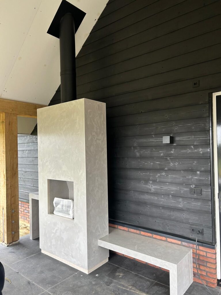 Buiten hebben wij onder de verande een openhaard geplaatst met een tafel links en bankje rechts. Ook deze haard is voorzien van een dubbelwandig kanaal in het zwart en afgewerkt met betonciré alleen in een lichtere kleur.
